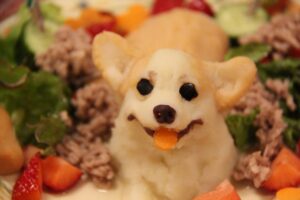 ケーキはマッシュポテトにお野菜や果物の汁で色をお付けしてます。