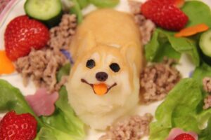 ケーキはマッシュポテトにお野菜や果物の汁で色をお付けしてます。
