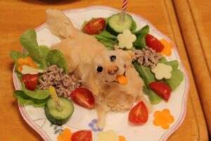 ケーキはマッシュポテトにお野菜や果物の汁で色をお付けしてます。