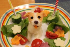 ケーキはマッシュポテトにお野菜や果物の汁で色をお付けしてます。