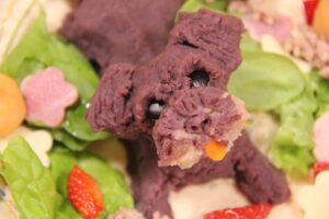 ケーキはマッシュポテトにお野菜や果物の汁で色をお付けしてます。