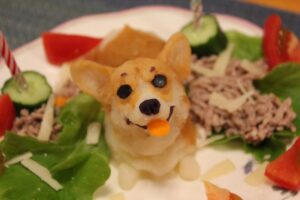 ケーキはマッシュポテトにお野菜や果物の汁で色をお付けしてます。