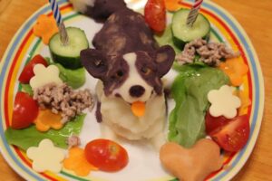 ケーキはマッシュポテトにお野菜や果物の汁で色をお付けしてます。