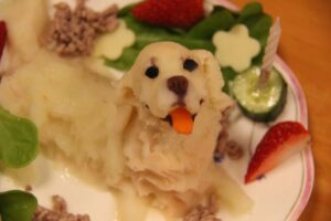 ケーキはマッシュポテトにお野菜や果物の汁で色をお付けしてます。