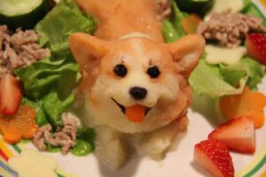 ケーキはマッシュポテトにお野菜や果物の汁で色をお付けしてます。