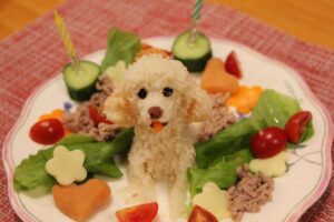 ケーキはマッシュポテトにお野菜や果物の汁で色をお付けしてます。